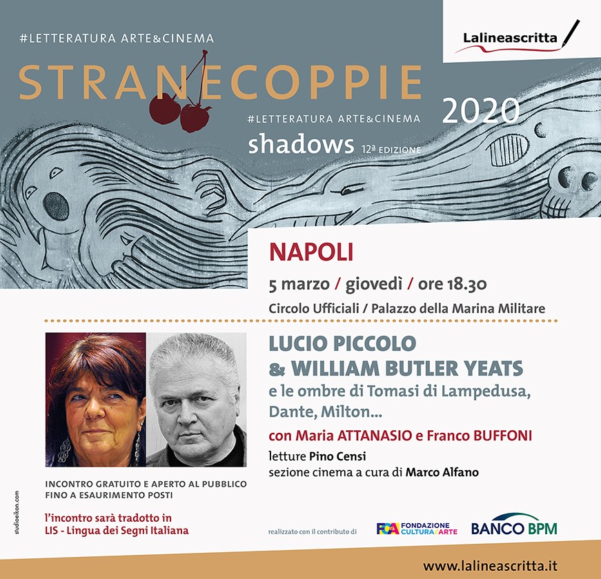 La bellezza delle ombre nel suono della parola dei poeti Lucio Piccolo e William Butler Yeats caratterizza il secondo appuntamento della rassegna culturale “Strane Coppie” in programma a Napoli giovedì 5 marzo alle 18.30, al palazzo della Marina Militare di Napoli, in via Cesario Console, 3 bis (Ingresso libero – info@lalineascritta.it)