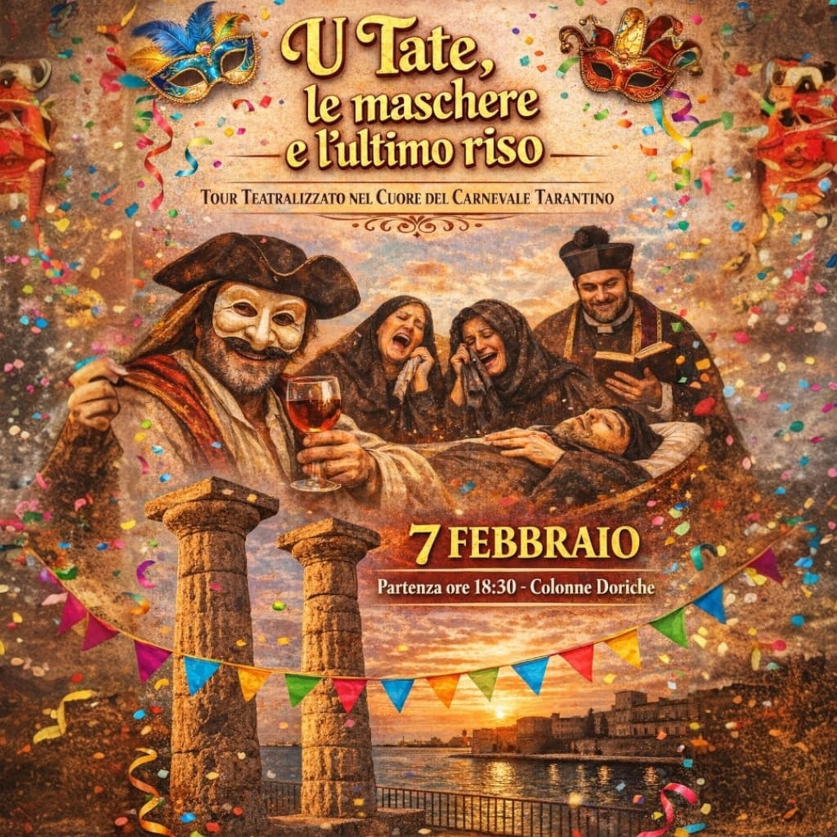 🎭 The ARTAVA Association, in collaboration with the Touring Club Italiano, invites you to an unmissable event in the heart of Taranto's Carnival! A captivating tour through the alleys of the old town to rediscover the traditions, characters, and masks of our... Saturday february 7 2026 Cultural "/>