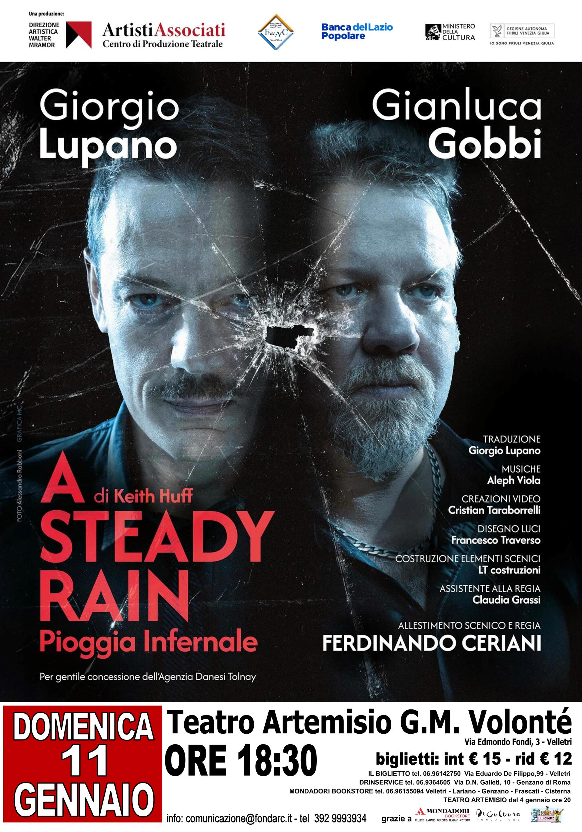 A Steady Rain (Pioggia Infernale) è uno spettacolo dello statunitense Keith Huff, fra gli autori della fiction House of Cards. Un testo pulp e noir che ha ispirato la prima stagione della serie True Detective, in cui due poliziotti raccontano ciascuno la propria versione dei fatti davanti alla commissione per gli Affari Interni, chiamata a giudicarli in seguito a un grave incidente verificatosi mentre erano in servizio.