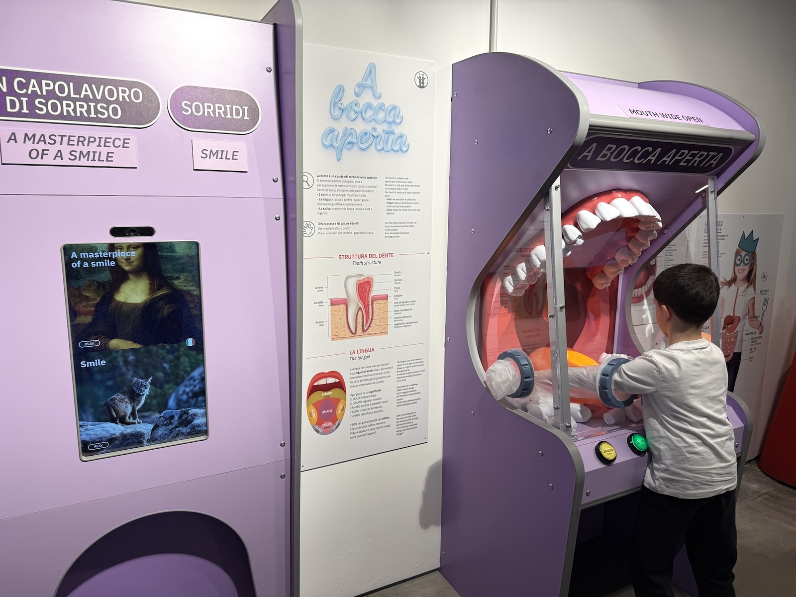 • A bocca aperta. Una grande bocca in scala accoglie bambine e bambini, invitandoli a ricostruire l’arcata dentale inferiore, riconoscere le diverse tipologie di denti e scoprire lingua e papille gustative attraverso un approccio giocoso e stimolante.