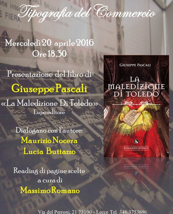 Mercoledì 20 aprile alle ore 18.30 la Tipografia del Commercio di Alberto Buttazzo ospita la presentazione del romanzo storico di Giuseppe Pascali "La maledizione di Toledo".
