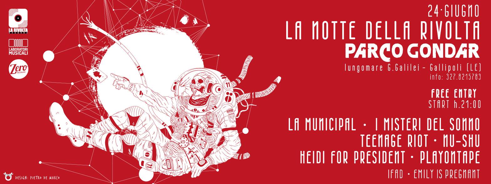 Venerdì 24 giugno La Notte della Rivolta fa tappa al Parco Gondar di Gallipoli per i venerdì live a ingresso gratuito della storica location, unendo idealmente i nuovi suoni e le nuove idee della nuova generazione salentina al più grande parco a tema d'Italia, che in questo stesso Salento riporta i grandi nomi della scena internazionale e non smette di promuovere una terra così prolifica di talenti. Protagonisti della serata, tutti targati Rivolta Records, saranno La Municipàl, i Misteri del Sonno, Teenage Riot, i Nu-Shu, Heidi For President, Playnotape, IFad e Emily Is Pregnant.