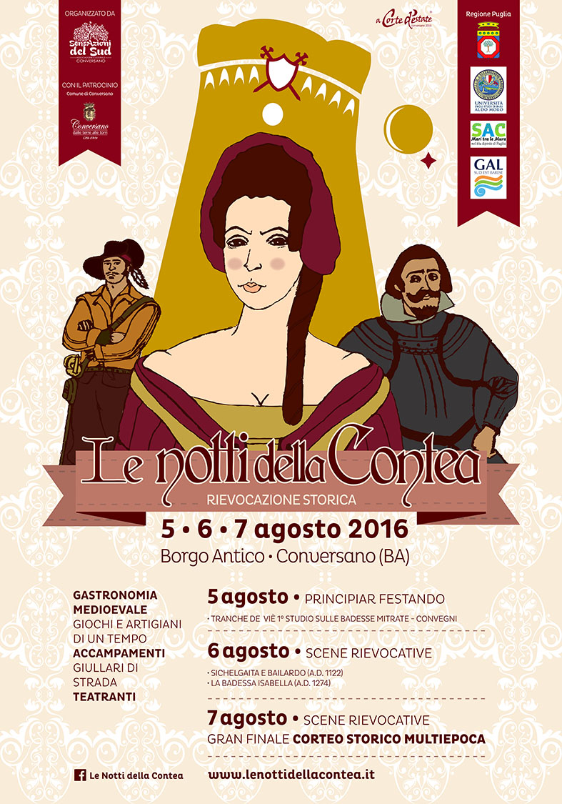 L’evento 2016 ha intenzione di allargare il punto di vista degli eventi narrati, al fine di rendere la festa non soltanto un’occasione di aggregazione, ma anche di riflessione culturale, nel quale la rievocazione storica diviene strumento di conoscenza del contesto culturale in cui la nostra identità si è formata. Inoltre, ogni anno, il nostro impegno si traduce in nuovi legami e collaborazioni con diverse realtà associative conversanesi : Animalenta, attraverso lo spettacolo “Tranche De Vie – 1° studio sulle Badesse Mitrate”; Polyxena, con le escursioni presso Castiglione “Torre al chiaro di Luna” e Pro Loco di Conversano, con le visite guidate “La Via dei Pellegrini”, Le 7 Muse di Apollo di Mola di Bari e diverse realta’ associative provenienti da tutta la Puglia.