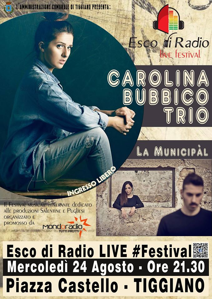 Ultimo appuntamento con il Tour 2016 di Esco di Radio LIVE, il Festival musicale itinerante dedicato alla produzioni salentine e pugliesi. Dopo i concerti di Alessano, Lucugnano e Tricase, ultimo tappa a Tiggiano in Piazza Castello con il concerto di Carolina Bubbico Trio e La Municipàl.