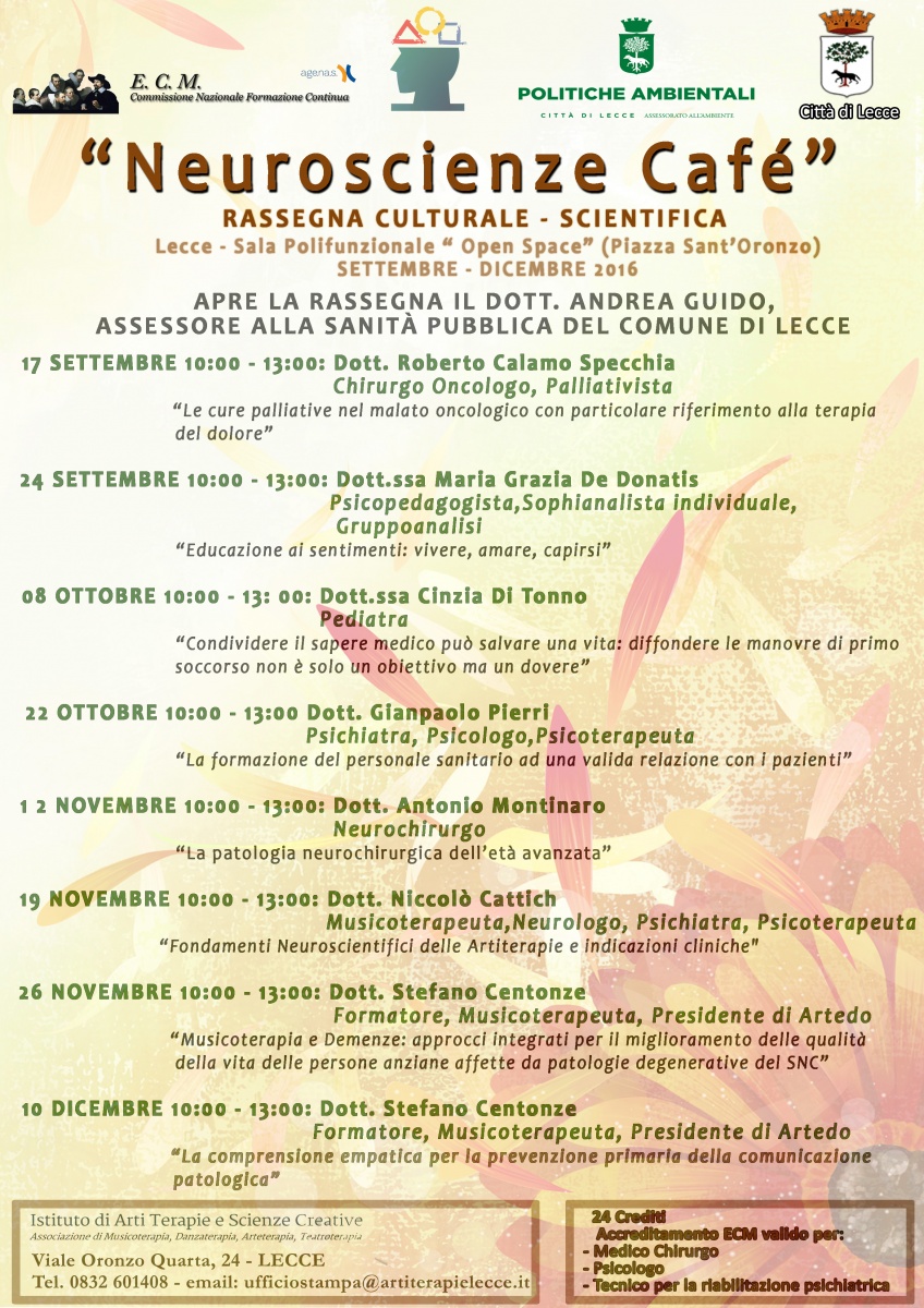 Si terrà sabato 24 settembre, a partire dalle ore 10:00, presso la Sala Polifunzionale “Open Space”, in piazza Sant’Oronzo, il secondo appuntamento con la Rassegna Culturale-Scientifica “Neuroscienze Café”, organizzata dall’Istituto di Arti Terapie e Scienze Creative in collaborazione con l’Assessorato alle Politiche Ambientali del Comune di Lecce.