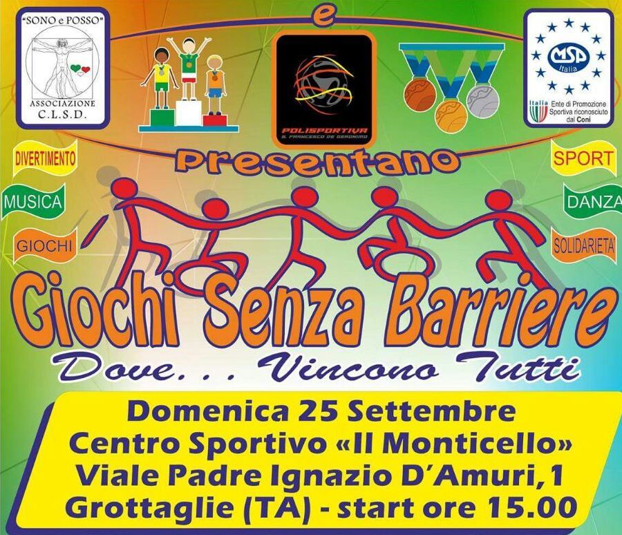 GROTTAGLIE (TA). Anche sette utenti del Centro Diurno di Statte parteciperanno all’iniziativa “Giochi senza barriere”, la maratona sportiva in cui “tutti vincono, nessuno perde”, in programma domenica 25 settembre, presso il centro sportivo “Il Monticello” di Grottaglie, in viale Padre Ignazio D’Amuri, 1. Start, ore 15.