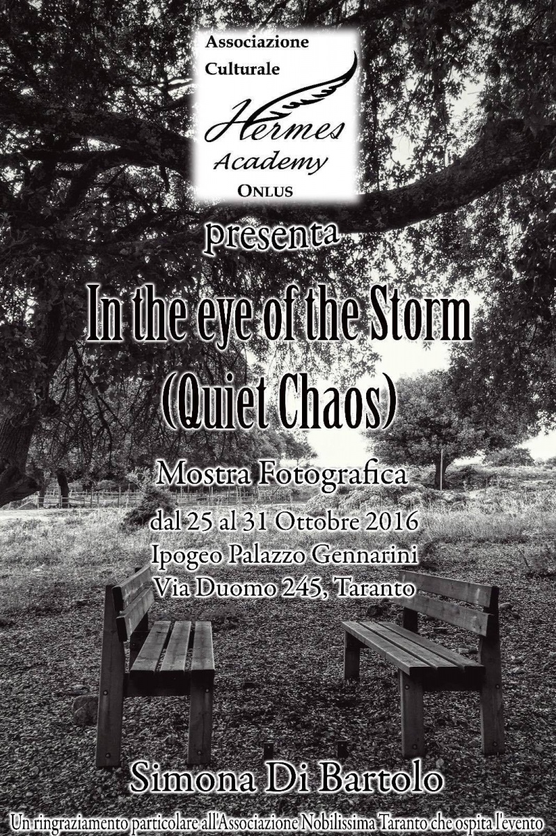 L’Associazione Culturale Hermes Academy Onlus organizza e presenta “In the Eye of the Storm (Quiet Chaos)”, mostra fotografica di Simona Di Bartolo, visitabile dal 25 al 31 ottobre presso l’Ipogeo di Palazzo Gennarini, in Via Duomo #245.