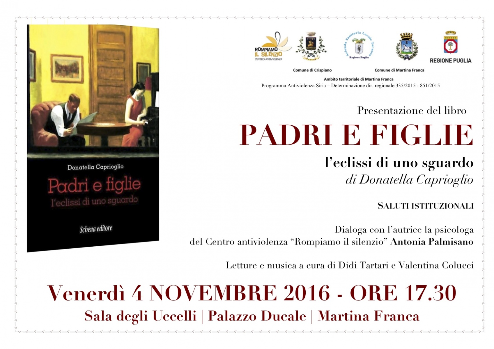 PADRI E FIGLIE, l’eclissi di uno sguardo di Donatella Caprioglio è il titolo del libro che il Centro Antiviolenza “Rompiamo il Silenzio” dell’Associazione “Sud Est Donne” presenterà il prossimo venerdì 4 novembre alle ore 17.30 nella Sala degli Uccelli a Palazzo Ducale di Martina Franca.
