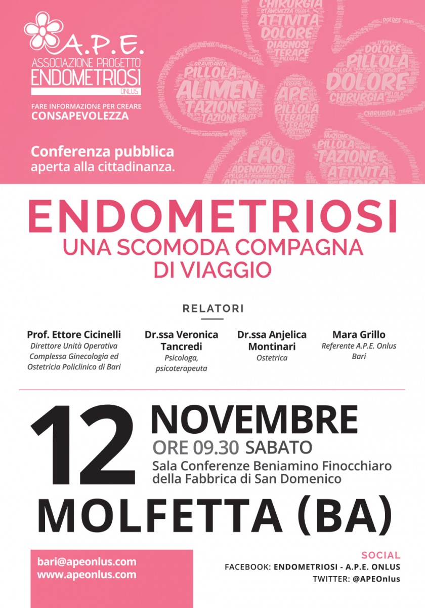 Il Gruppo di sostegno di Bari dell’Associazione Progetto Endometriosi ha organizzato per sabato 12 novembre un’interessante conferenza pubblica dal titolo “Endometriosi: una scomoda compagna di viaggio”. Appuntamento da non perdere, dalle ore 9.30, presso la Sala Conferenze Beniamino Finocchiaro della Fabbrica di San Domenico. Interverranno in qualità di relatori il Prof. Ettore Cicinelli – Direttore Unità Operativa Complessa Ginecologia ed Ostetricia Policlinico di Bari; la Dr.ssa Veronica Tancredi – psicologa/psicoterapeuta, la Dr.ssa Anjelica Montinari – Ostetrica e la Sig.ra Mara Grillo – Referente A.P.E. Onlus Bari.