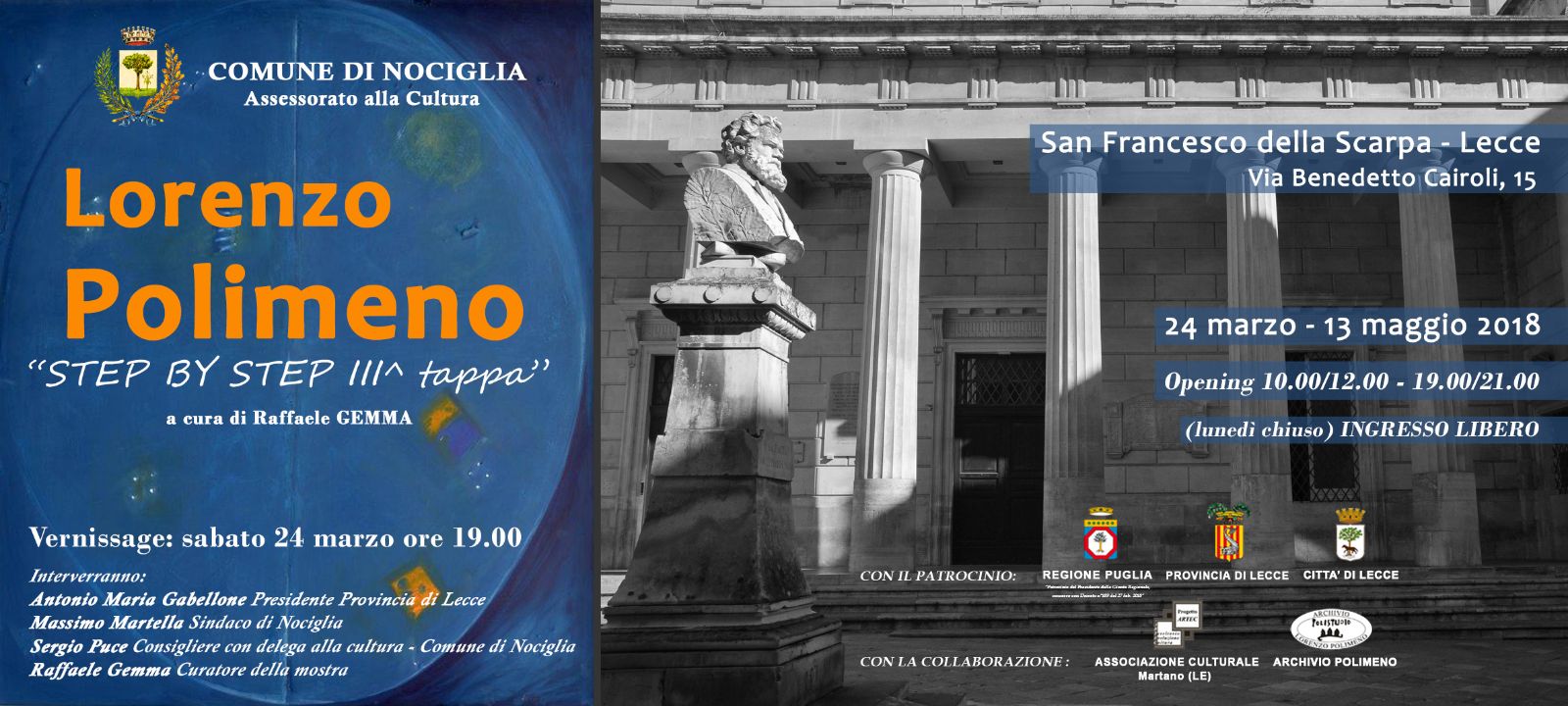 La terza tappa di “Step by step”, la grande mostra antologica di Lorenzo Polimeno in quattro tappe si tiene questa volta a Lecce dal 24 marzo fino al 13 maggio 2018 (vernissage sabato 24 marzo ore 19) nello storico Complesso Museale di San Francesco della Scarpa. Trattasi di un evento culturale di grande portata, organizzato dal Comune di Nociglia fuori dal proprio territorio, e questa è una particolarità, eseguito tra l'altro in occasione dei quaranta di attività del maestro e curato interamente da Raffaele Gemma, com'è stato anche per le due prime due tappe già portate a termine nell'estate del 2017 rispettivamente nell'ex-Chiesa della Madonna di Costantinopoli in Tricase (LE) e di seguito a Nociglia (LE), nel Palazzo Baronale Gallone-Pignatelli. Dopo la tappa di Lecce “Step by step” andrà a concludersi infine a Matera, in occasione degli eventi culturali di “Matera capitale della cultura europea per il 2019”. La mostra assume quindi le caratteristiche di un'itinerante alquanto singolare, visto che l'artista ogni volta ci riserva delle opere inedite che vanno ad aggiungersi ad una produzione più che corposa, come nel caso dei “Reperti” e “Scudi” (Shields), opere che stanno suscitando a livello internazionale un interesse notevole da parte degli operatori culturali del sistema museale, del mondo delle gallerie e del settore del collezionismo e delle aste.