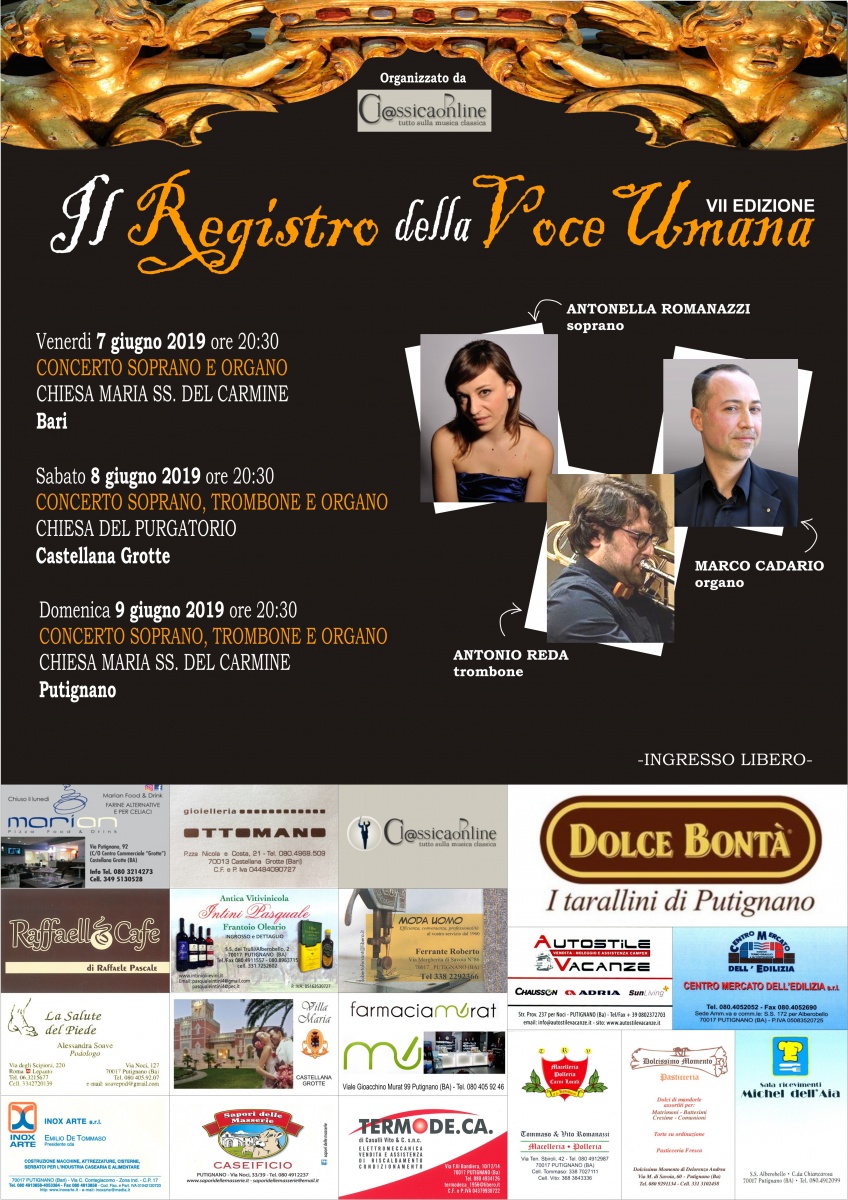 ed il 9 giugno a Putignano presso la Chiesa Maria SS. Del Carmine (soprano, organo, trombone).