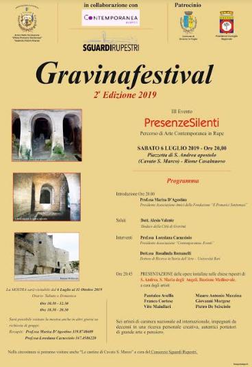 Ora Gravina di Puglia vuole dialogare con altre fedi, altri angeli, altri uomini, capaci di immedesimarsi nel suo set naturale, tracciare nuovi segni di vitalità, rimuovendo il lungo silenzio ,nell’intento di ritrovare la sua presenza,unica ed irripetibile, carica di luce proiettata sulle sue preziose memorie archeologiche e storiche.