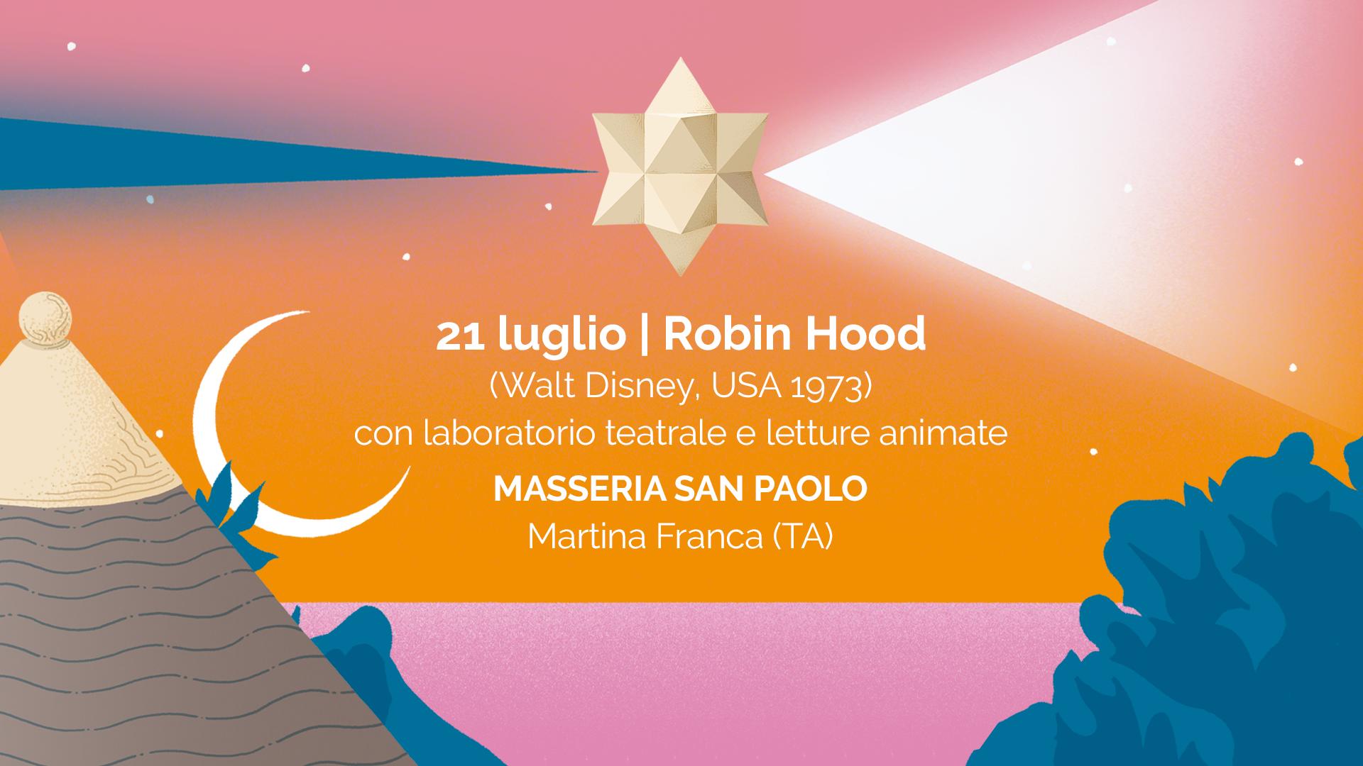 La prima tappa si svolge in uno dei luoghi che durante la prima edizione è rimasto nel cuore: l’Allevamento San Paolo a Martina Franca, una masseria immersa nel verde della Valle d’Itria dove si allevano i cavalli più eleganti della Puglia. In programma due giorni consecutivi, il primo sabato 20 luglio, dedicato a un pubblico più adulto con la proiezione di Green Book, regia di Peter Farrelly, anteceduta dalla performance musicale SKRUUM dove sonorità jazz si mischiano a una ricerca elettronica e sperimentale; e domenica 21 luglio una giornata dedicata alle famiglie e ai più piccoli con lo storico Robin Hood prodotto nel 1973. Prima della proiezione, a partire dalle h 19 il laboratorio teatrale Sindrome di Clown, a cura di Angelo Susco seguito da letture animate a cura di FuturBooks e l’Associazione Insieme per l’autismo – Martina Franca.