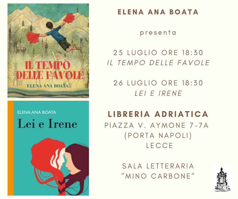 Tra parole e musica, due pomeriggi da passare in compagnia dei libri, scoprendo gli ultimi titoli della versatile autrice Elena Ana Boata: il 25 e il 26 luglio a Lecce, presso la sala letteraria “Mino Carbone” della Libreria Adriatica (Piazza V. Aymone 7-7A, Zona Porta Napoli), in programma un doppio appuntamento gratuito e aperto al pubblico per assistere alla presentazione della raccolta per bambini ‘Il tempo delle favole’ e del romanzo ‘Lei e Irene’.