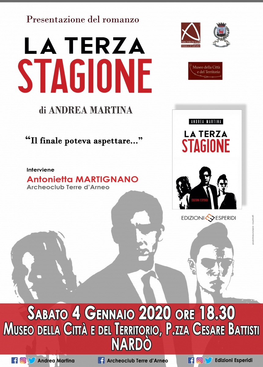 Sabato 4 gennaio 2020 alle ore 18.30, l' Archeoclub Terra d'Arneo di Nardò accoglierà la presentazione del nuovo libro di Andrea Martina, il romanzo dal titolo “La Terza Stagione”, edito da Edizioni Esperidi.