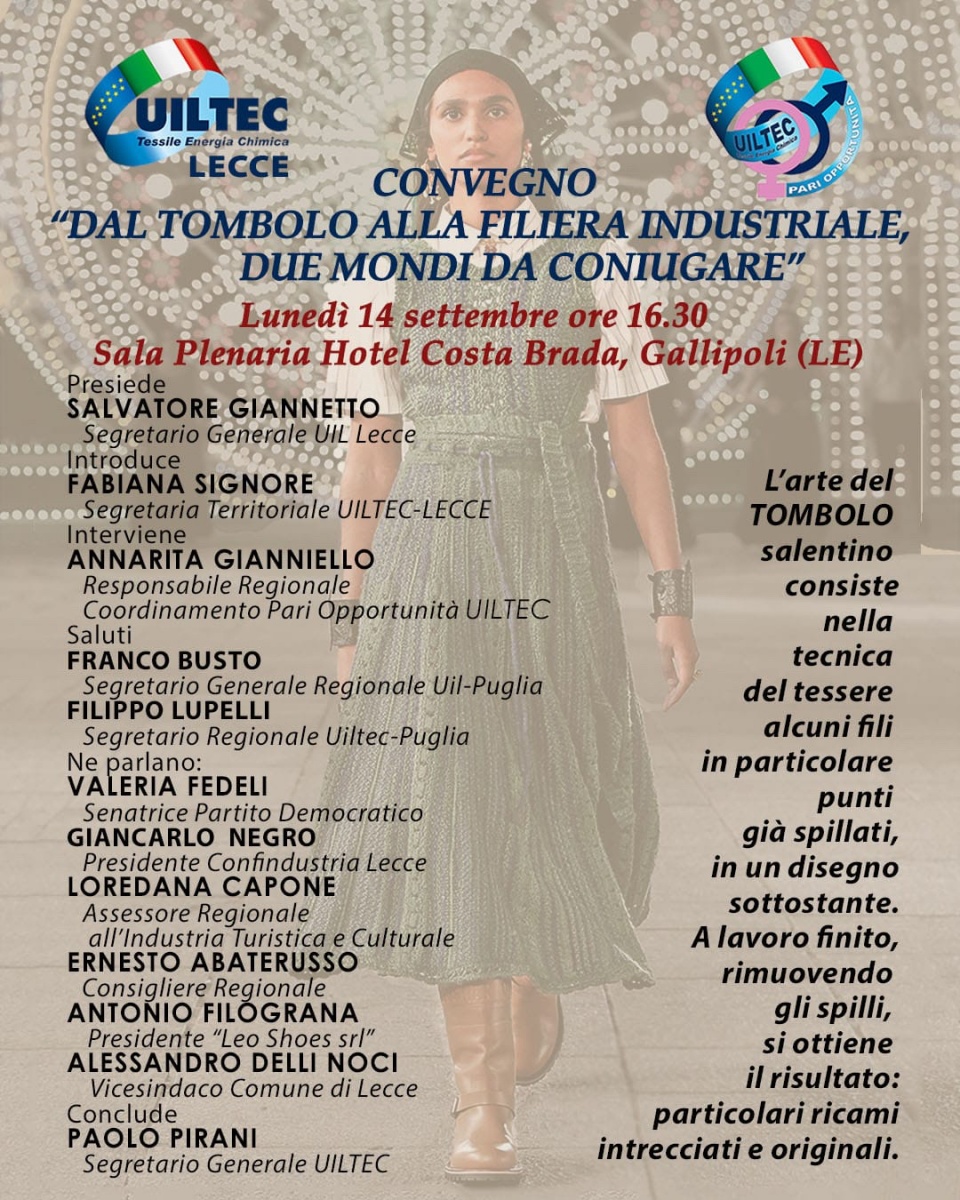 “Dal tombolo alla filiera industriale, due mondi da coniugare” è il tema del convegno promosso e organizzato dalla Uiltec di Lecce - sindacato dei lavoratori tessili, dell'energia e della chimica - in collaborazione con il Coordinamento regionale Pari opportunità della categoria, per riflettere sul futuro del settore-moda pugliese dopo il successo della sfilata Dior a Lecce, un progetto che ha coinvolto diverse realtà imprenditoriali del territorio e portato alla ribalta mondiale l’arte sapiente degli artigiani nostrani.