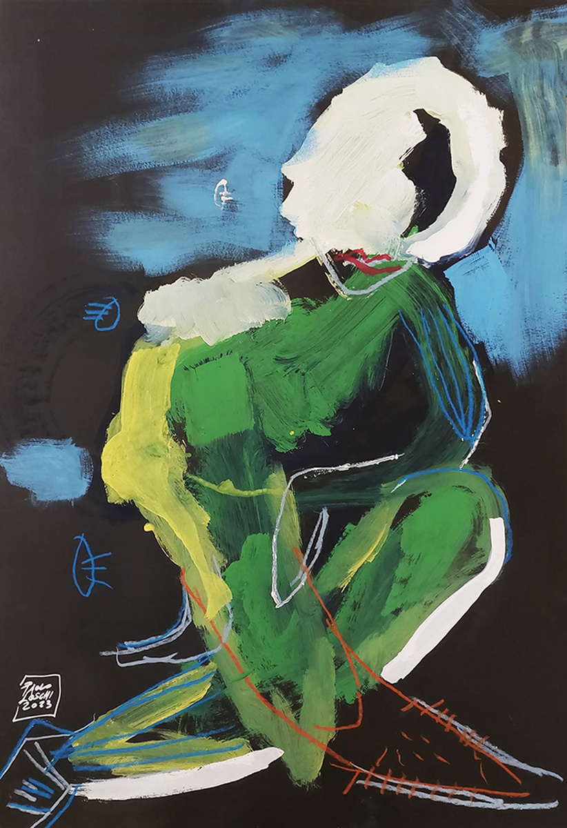 Nel suo lavoro si riconosce bene l'estrema sintesi dell'informale di Licini, dell'espressionismo astratto di Cobra, del graffitismo di Basquiat, di quei personaggi fantastici e colorati di Klee ma il suo gesto, la sua cifra pittorica, è la somma di tutti i gesti, ormai fortemente riconoscibile, nel segno così come nel colore. Un gesto maturo, denso, corposo, a volte veloce, a volte lento, un gesto ormai "a togliere", come da grande lezione di Miles Davis, a volte violento, a volte dolcissimo, come dolcissimo è l'amore, a volte lungo, a volte profondo, "come profondo è il mare".