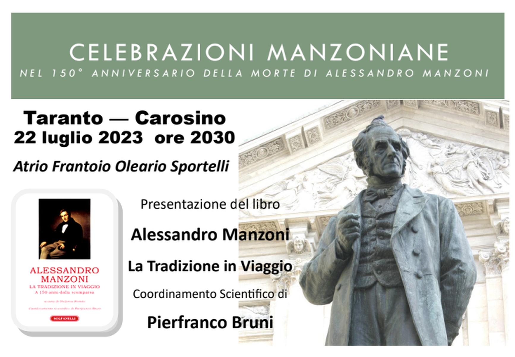 Carosino (TA) sarà prossimamente tempio di alta Cultura. Nella Città del Vino alle porte di Taranto, si parlerà di Alessandro Manzoni in occasione del 150^ anniversario della sua morte. Ma a ben vedere, c’è molto altro di più nella manifestazione carosinese del 22 luglio che si terrà tra qualche giorno nella splendida cornice offerta dall’atrio del Frantoio Oleario Sportelli, a partire dalle ore 20:30.