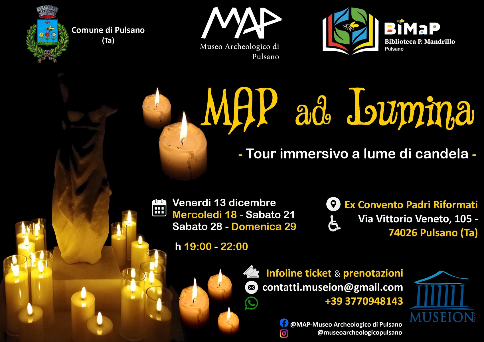 Società Cooperativa Museion, ente gestore e affidatario dei servizi culturali e museali del MAP. “MAP ad Lumina” è un progetto originale e innovativo di arte immersiva, un’operazione in cui l’ambiente circostante interagisce con le opere d’arte, diventandone parte integrante, aprendo una riflessione e maggior raccordo tra: arte, storia, archeologia e architettura. L’esposizione accompagnerà i visitatori lungo le sale del museo, in dialogo continuo con la collezione archeologica permanente, consentendo di ammirare da vicino i reperti, apprezzandone i particolari e le tecniche artistiche di light design. Il tour immersivo Xmas Edition sarà visitabile secondo calendario d’apertura del mese di dicembre delle feste natalizie, mediante ticket d’ingresso. Ammira le forme scolpite dagli antichi maestri alla luce d'una candela. Si dice che i maestri scalpellini e gli scultori amassero far visitare i propri studi a luci spente, illuminati solo dalla flebile luce di candele sparse qua e là. Oggi puoi farlo anche tu! Vivere un'esperienza unica nell’ ex Convento dei Padri Riformati a Pulsano, dove? Nel museo Archeologico di Pulsano. Immergiti completamente nelle opere del grande del passato e visita il nostro museo illuminato solo da candele sparse qua e là. Solo così potrai apprezzare pienamente le forme sinuose delle opere dei grandi artisti del passato. Accompagnato dalle nostre guide, potrai comprendere meglio l'importanza di questi capolavori assoluti dell’arte e scoprire il lato inedito della loro bellezza e unicità.