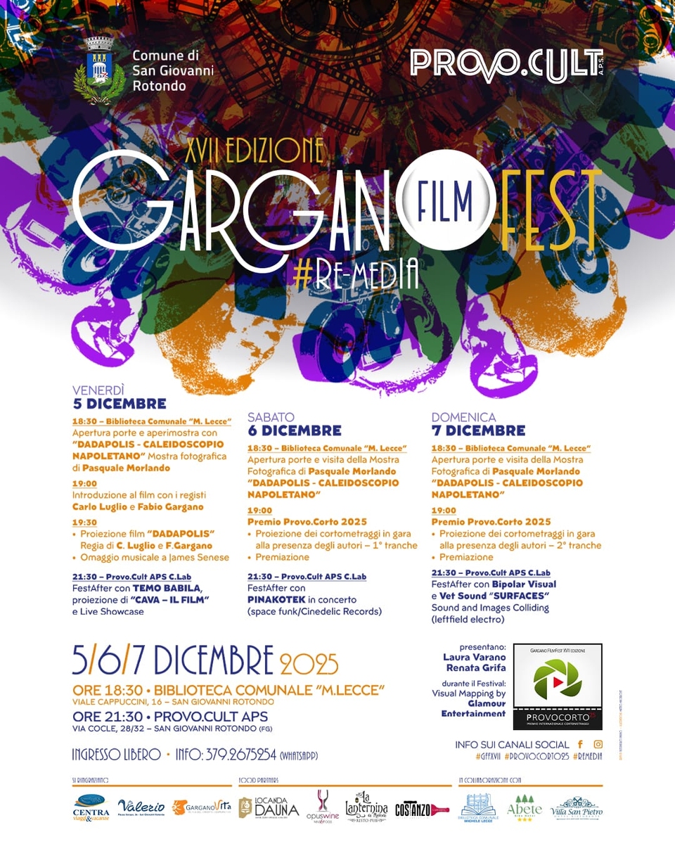 Torna il Gargano FilmFest a San Giovanni Rotondo, storica rassegna di cinema, cortometraggi e contaminazioni culturali organizzata dall'associazione di promozione sociale Provo.Cult e diventata ormai un punto di riferimento in provincia e non solo, capace di traghettare dal 2008 ad oggi artisti del calibro di Elio Germano, HER, Marco Cocci, Margherita Vicario, Agostino Ferrente, Giovanni La Parola, Pippo Mezzapesa, Benedetta Barzini, Riccardo Sinigallia, Nico Cirasola, Annalisa Camilli, La Batteria, Davide Barletti, Peppe Leone, Roberto De Feo, Marco Bonini, Salvatore Marino, Giuseppe Bonito e tanti altri.
