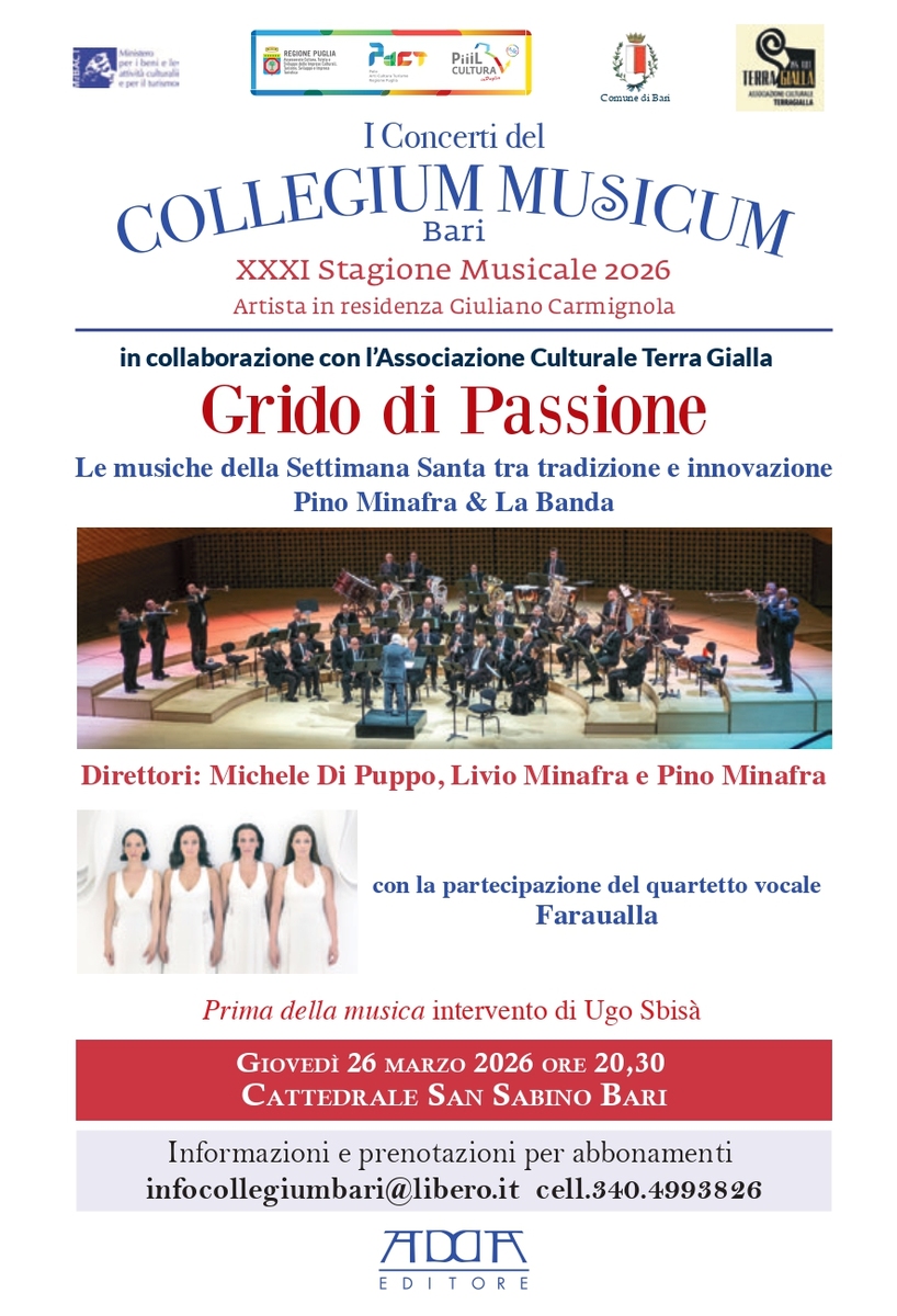 Inserito nel cartellone della trentunesima stagione del Collegium Musicum, diretto da Rino Marrone, “Grido di Passione. Le musiche della Settimana Santa tra tradizione e innovazione” rappresenta uno dei momenti più intensi e simbolici, in programma per l’edizione 2026. Un evento in collaborazione con l’Associazione Culturale Terra Gialla che vedrà protagonista, il 26 marzo, alle ore 20.30 nella Basilica Cattedrale di San Sabino a Bari, Pino Minafra & La Banda. Formazione, quest’ultima, composta da quarantacinque musicisti e diretta da Michele Di Puppo, Livio Minafra e lo stesso Pino Minafra, con la partecipazione del quartetto vocale femminile Faraualla. Prima dell’esecuzione è previsto un intervento introduttivo di Ugo Sbisà, docente di Storia del jazz presso il Conservatorio Piccinni di Bari.