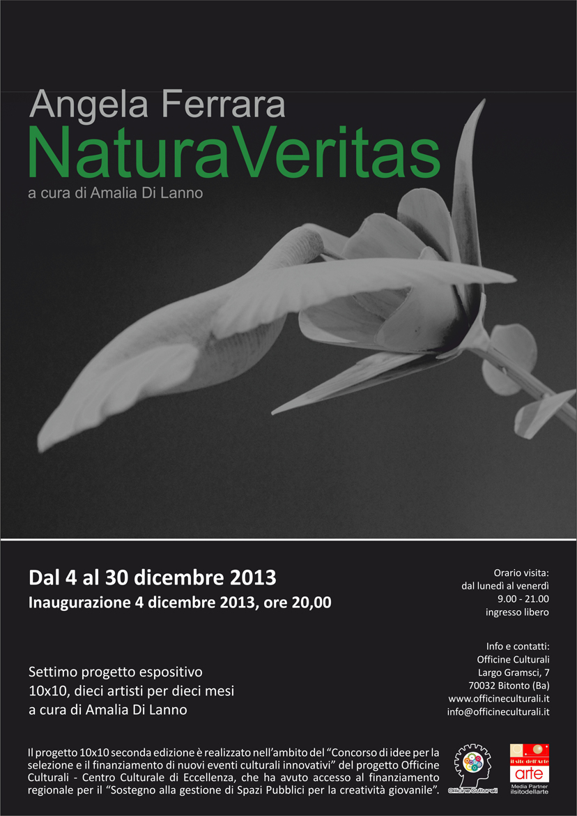 Nell’ambito del progetto culturale 10x10, dieci artisti per dieci mesi, riformulato in seconda edizione da Amalia Di Lanno, si inaugura mercoledì 4 dicembre 2013 alle ore 20.00 nella sala espositiva del Laboratorio Urbano Officine Culturali di Bitonto (Ba) la mostra NaturaVeritas di Angela Ferrara a cura di Amalia Di Lanno.