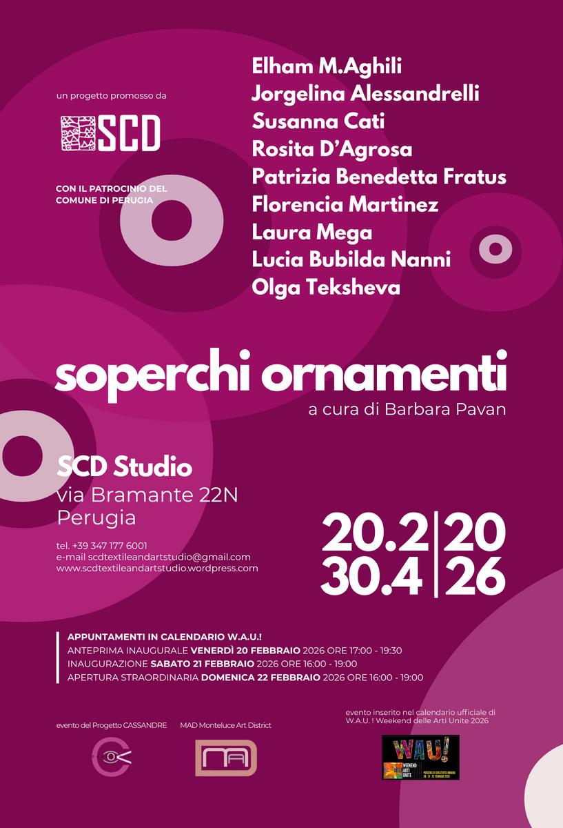 Dal 20 febbraio al 30 aprile 2026, SCD Studio presenta SOPERCHI ORNAMENTI, progetto espositivo a cura di Barbara Pavan ospitato negli spazi di via Bramante 22N, all’interno del MAD Monteluce Art District di Perugia.